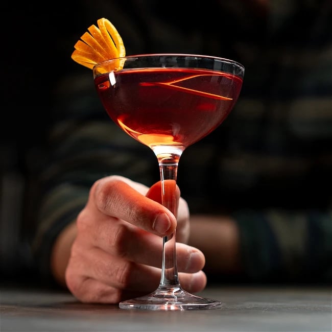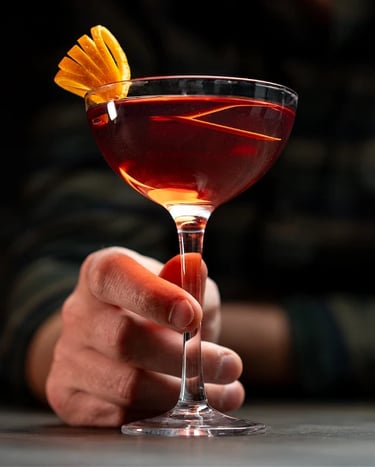 Ron añejo, vermut rojo, triple sec, Unas gotas de granadina. Suave, aromático y sofisticado.